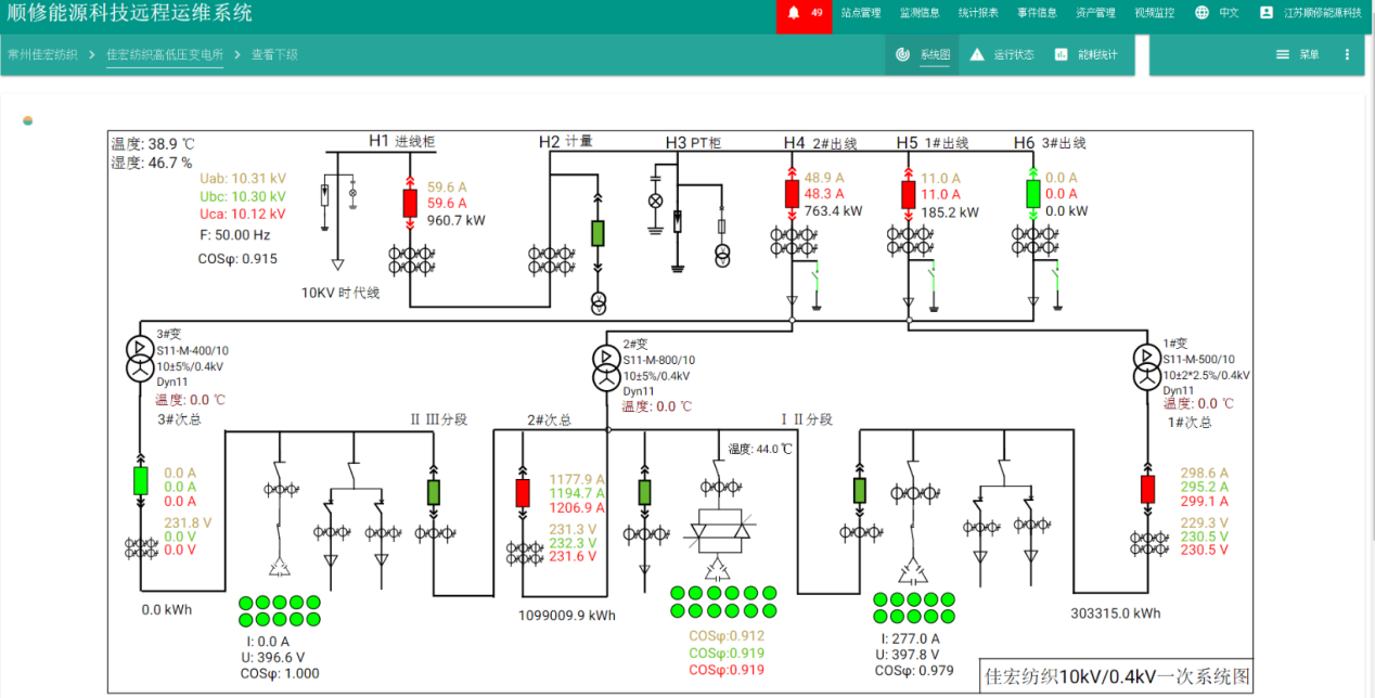 用戶(hù)可通過(guò)變配電系統(tǒng)一次圖,直觀、實(shí)時(shí)的了解高低壓回路開(kāi)關(guān)的狀態(tài),以及回路電流、電壓、功率等電量參數(shù)。