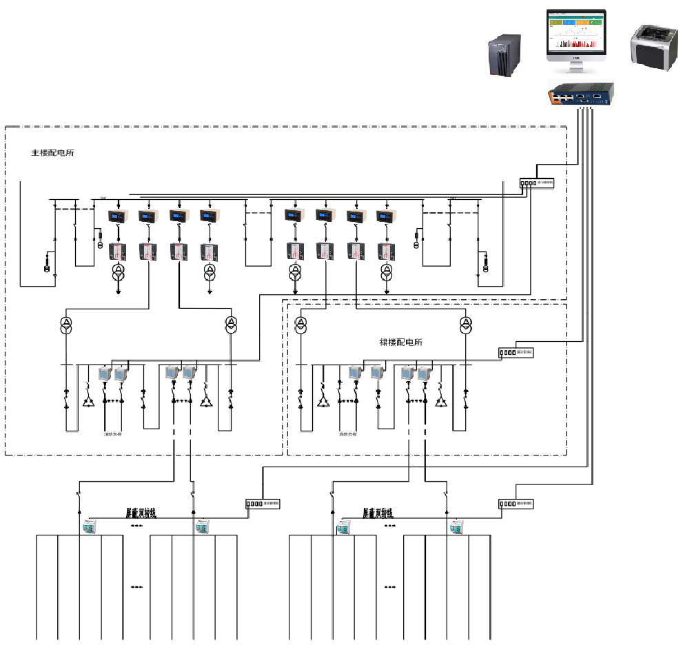 網(wǎng)絡(luò)通信層:網(wǎng)絡(luò)通信層是由各類(lèi)通信設(shè)備和通信介質(zhì)組成的網(wǎng)絡(luò),實(shí)現(xiàn)系統(tǒng)整體管理層與現(xiàn)場(chǎng)測(cè)控層設(shè)備間的信息交互。網(wǎng)絡(luò)一般采用工業(yè)以太網(wǎng)、光纖環(huán)網(wǎng)以及RS485總線結(jié)構(gòu),主要包含S3100系列通信管理機(jī)、工業(yè)以太網(wǎng)交換機(jī)、光纖收發(fā)器以及光纖、通信線纜等設(shè)備。