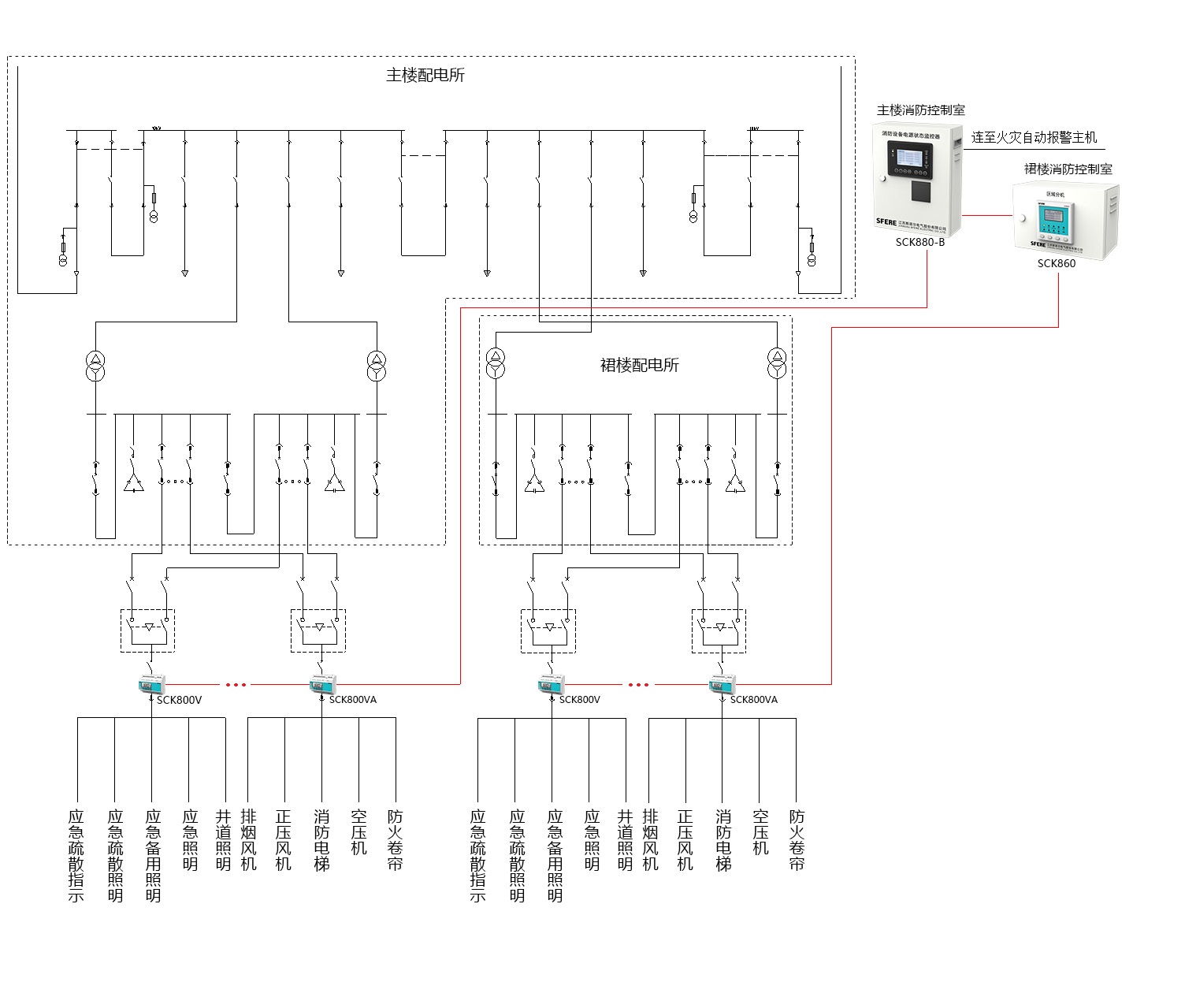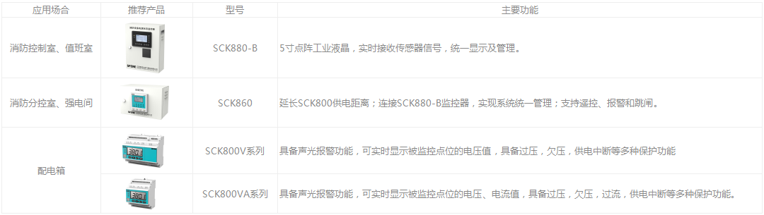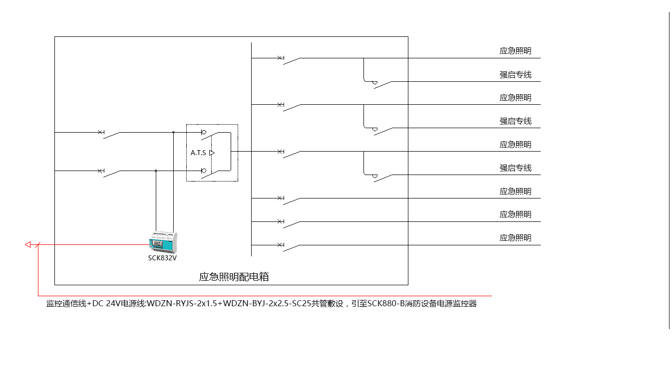 防火卷簾、應急照明等系統只在火災初期短時工作,不易出現過負荷,短路等情況,可只監測電源狀態,簡化系統,降低報價。建議在電源進線處安裝一臺SCK832V電壓信號傳感器,監測雙電源轉換開關前端兩路電壓。