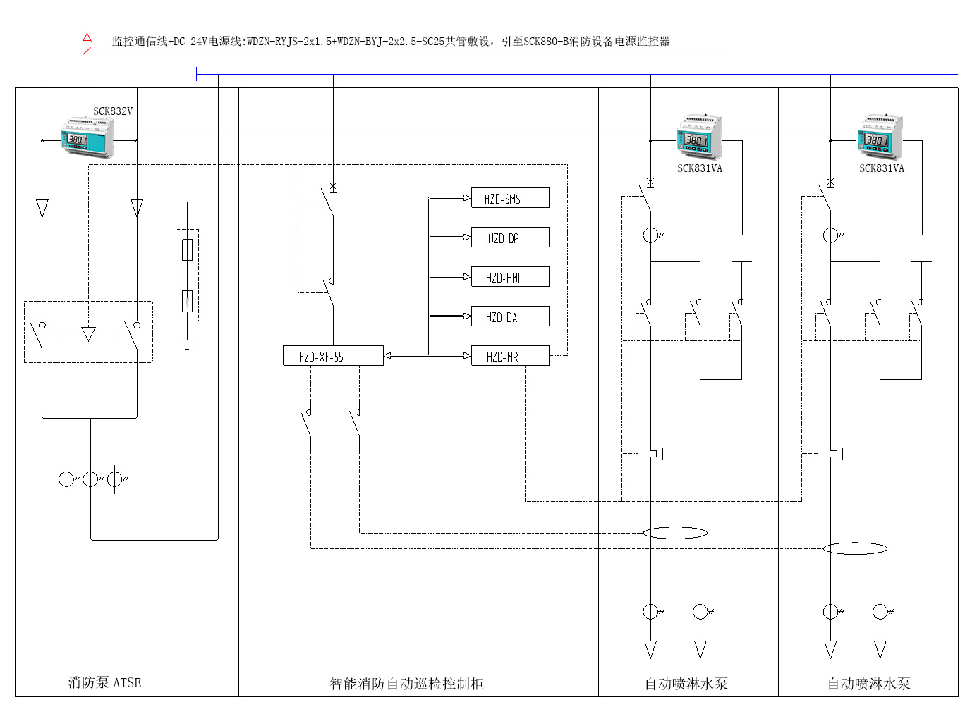 消防泵房一般設置于地下,是放置消防泵的設備房,包括消火泵、噴淋泵和其他消防用泵。消防泵屬于重要的滅火設備,因此需要對各消防泵的電源及工作狀態做全面監控。建議在進線處安裝一臺SCK832V電壓信號傳感器,對雙電源電壓進行監測,出線回路各安裝一臺SCK831VA電壓/電流信號傳感器,對出線電流、電壓進行監測。
