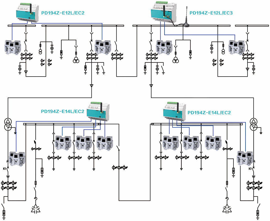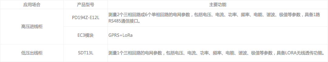 本方案高壓采用PD194Z-E12/EC3多回路儀表可同時監(jiān)測兩路高壓主備進線,電壓采樣高壓PT柜內(nèi)二次電壓,電流采樣可取測量CT二次回路,低壓采用SDT13穿刺式安裝儀表,采用LoRa無線透傳方案,可通過GPRS遠傳模塊上傳至企業(yè)能耗管理平臺或政府能耗管理平臺等第三方平臺系統(tǒng)。