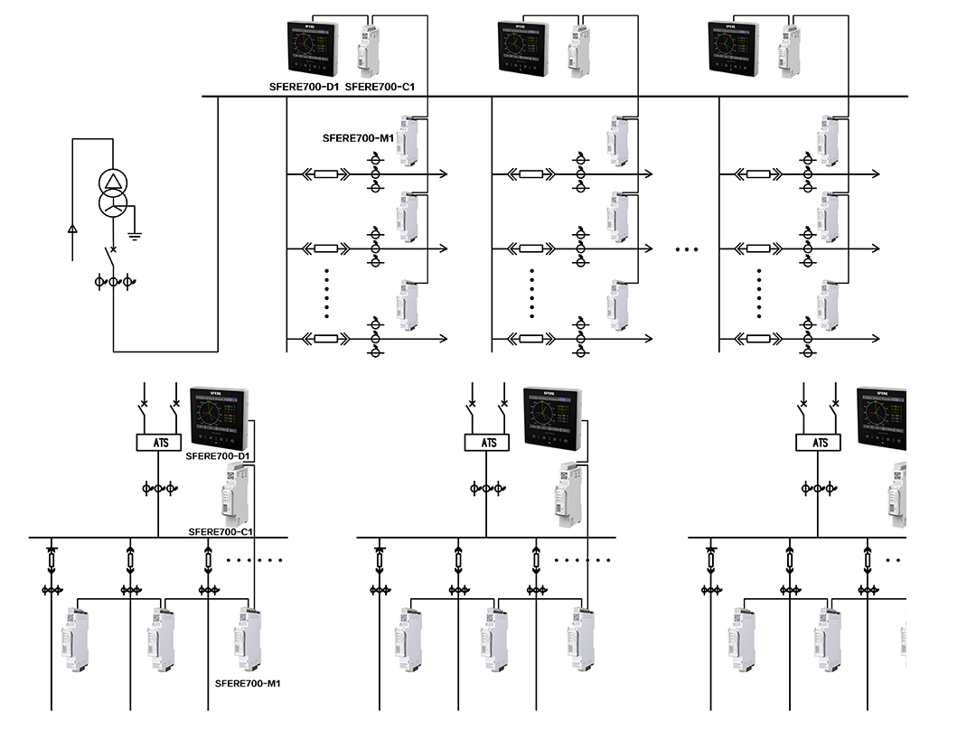 本方案低壓側(cè)采用SFERE700分布式多回路儀表,配電柜或配電箱每個回路可安裝SFERE700-M1測量模塊,可通過SFERE700-C1通信模塊及SFERE700-D1顯示模塊實現(xiàn)就地顯示功能。